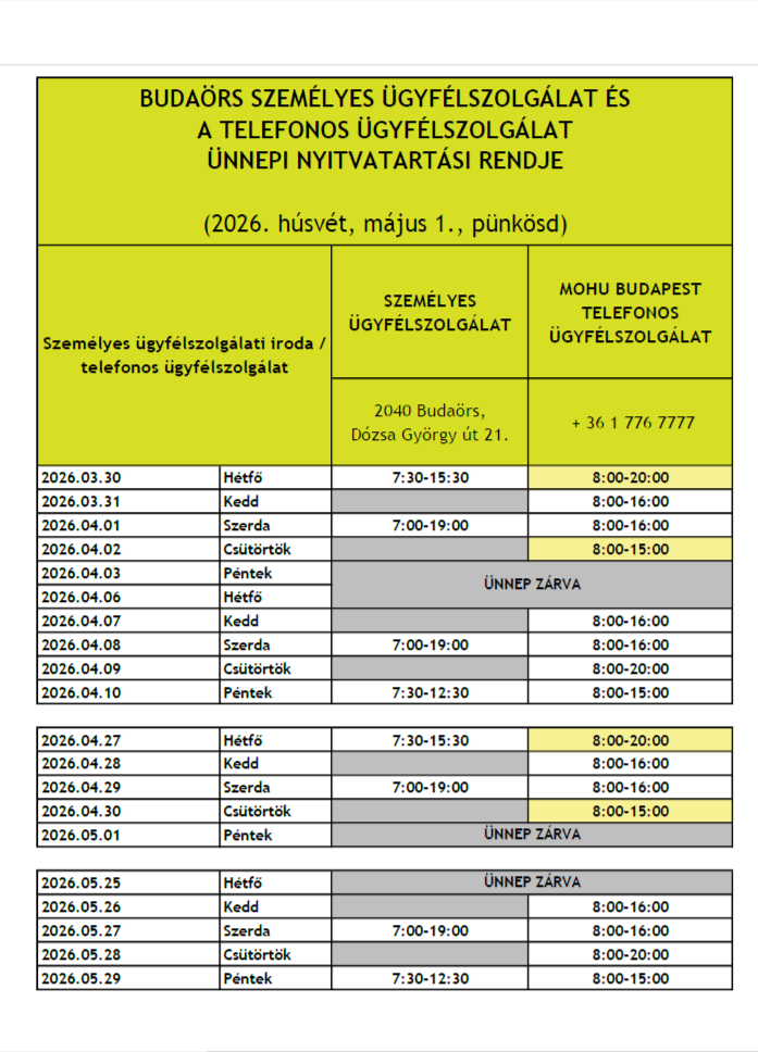 Tájékoztatjuk Önöket, hogy a BTG Nonprofit Kft. és a MOHU BUDAPEST Zrt. közös személyes ügyfélszolgálata a lenti időpontokban áll rendelkezésre az ünnepek alatt (2026. Húsvét, Május 1., Pünkösd) Budaörsön.